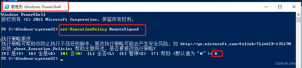 set-ExecutionPolicy RemoteSigned更改 PowerShell 执行策略,过程中提示询问是否要更改执行策略?,选择 A 或 Y ,即可